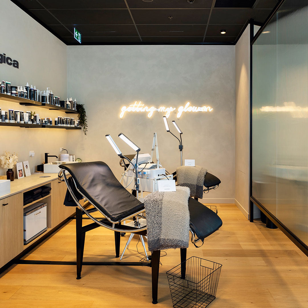 We aim for a visible difference after just one treatment. Another thing that is unique about our approach is our open plan treatment lounge. A million miles away from the wind chimes and whale sounds of the standard spa environment, our salons are as energetic and enlivening as our treatments